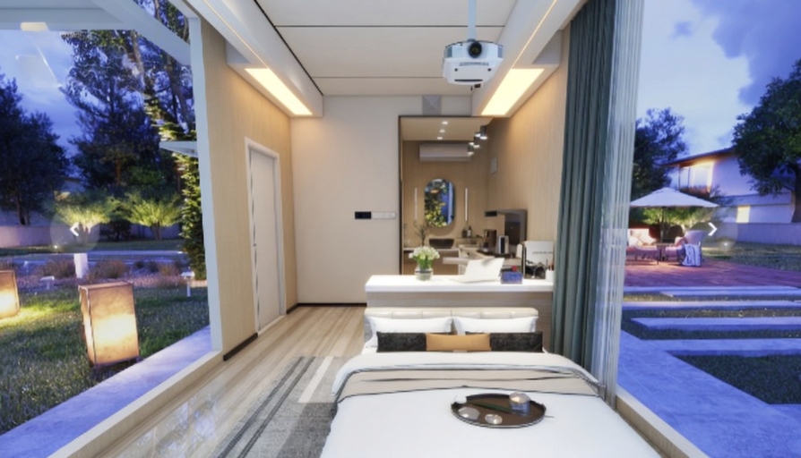 Capsula Modulara Eclipse 27.2 m² cu design minimalist modern. Echipată cu living, balcon, bucătărie, dormitor, baie, încălzire în pardosea și control vocal.