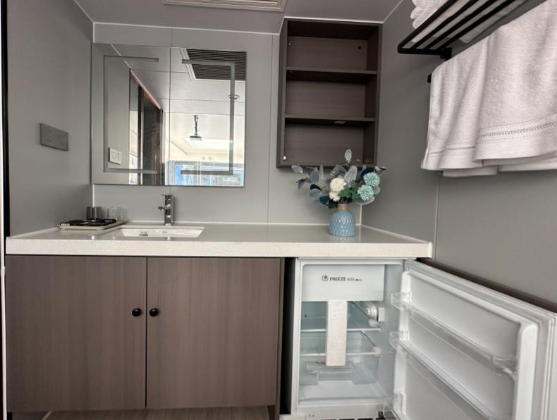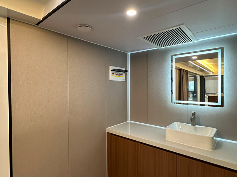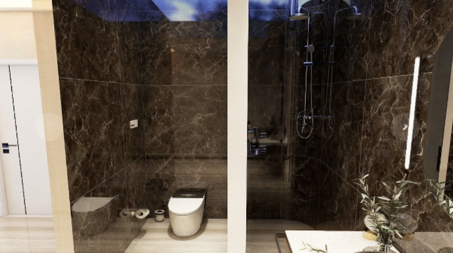 13. Mobilier baie complet – Chiuvetă, blat, oglindă smart,toaletă smart și spațiu de depozitare.