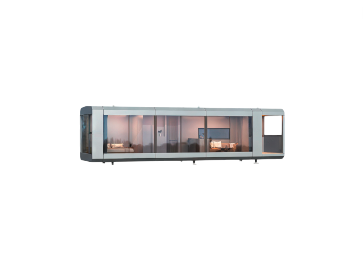Capsula Modulara EcoDome 38 m² cu design minimalist modern. Echipată cu living, bucătărie, dormitor, baie, terasă, încălzire în pardosea și control vocal.